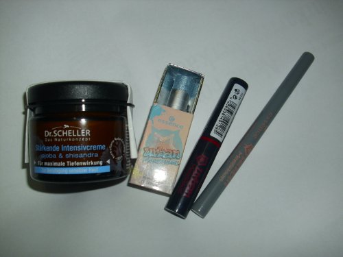 Make-up Set 4tlg. (Dr. Scheller Stärkende Intensivcreme Jojoba & Shisandra für sensible Haut 50ml Tagescreme, Essence Urban Messages Eyeshadow Chalk Lidschatten Stift Nr. 04 Street Styler Türkisblau 3g, Essence Urban Massages Lipstick Lippenstift für intensive Farbeffekte 1,6g Farbe: Kaminrot und Essence Urban Massages Eyeliner Pen Nr. 02 Skycraper Farbe: Grausilber. 1ml Eyeliner für einen präzisen Lidstrich.